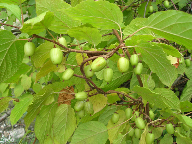 Актинидия Великанша - среднего срока созревания, в конце августа. Форма плода округлая, сжатая с боковых сторон. Окраска равномерная ,оливково-зеленая. Вкус кисловато-сладкий, с ананасовым ароматом