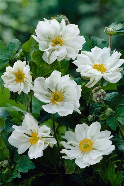 Высота 85 см. Ширина 50 см. Диаметр цветка 8-9 см. Лепестки со слегка гофрированными краями, собранные в полумахровые белоснежные соцветия красиво сочетаются с типичной для анемон темно-зеленой, глубоко-разрезанной, немного щетинистой листвой.