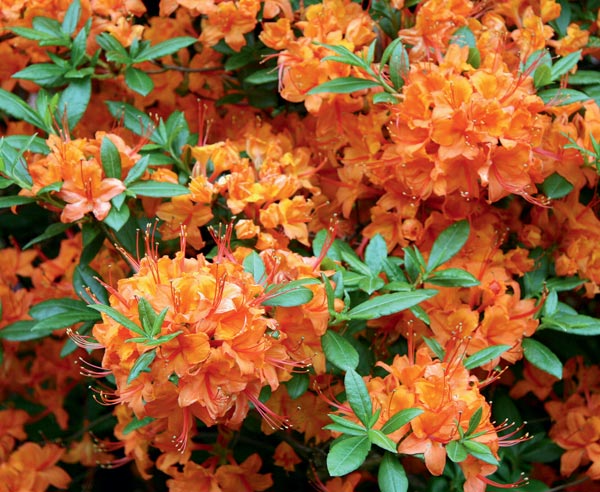 Рододендрон листопадный или азалия Coccinea Speciosa - строго вертикальный кустарник, у старых растений ассиметричная воронковидная форма, медленнорастущий. 1.5-2 м высотой и шириной. Цветки оранжевые, крупные, в форме колокольчика или чаши, ароматные, многочисленные. Листья при распускании бронзовые, затем темно-зеленые, осенью изначально малиново-красные, затем оранжево-желтые. Данная азалия листопадная более устойчива, чем вечнозеленые виды.