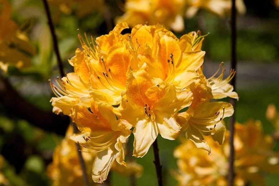 Азалия Golden light - шикарный цветущий кустарник. Отличается великолепным декоративным цветом. В высоту растение достигает 1 м. Листочки мелковатые, ланцентные и простые. Обладают красивым темно-зеленым оттенком. Цветки красивой крупной формы золотисто-желтого окраса. Сорт начинает зацветать поздно, примерно с конца мая. Цветки могут держаться от двух недель.