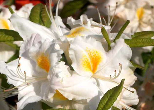 Азалия Schneegold - листопадный среднерослый кустарник с округлой кроной, в высоту растет до 1,0 м, разрастаясь в диаметре до 0,8-1,0 м. Листья светло-зеленые, овальные, осенью листва становится оранжево-желтой. Цветки крупные, раскрытые, белоснежные с красивым золотистым пятном из штрихов на верхнем лепестке. Цветение обильное, продолжительное.