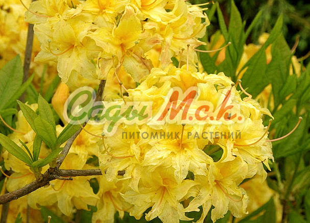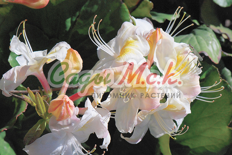 Азалия, Рододендрон желтый Сильфидес - сорт листопадных рододендронов гибридного происхождения. В возрасте 10 лет высота около 1,5-2,0 м Крона округлая. Листья блестящие, молодые красно-коричневые, позже зелёные. Соцветия несут 8—14 цветков. Цветки воронкообразные, бело-пурпурно-розовые с ярким жёлтым пятном. Цветки с ароматом средней интенсивности. Цветение в мае—июне.