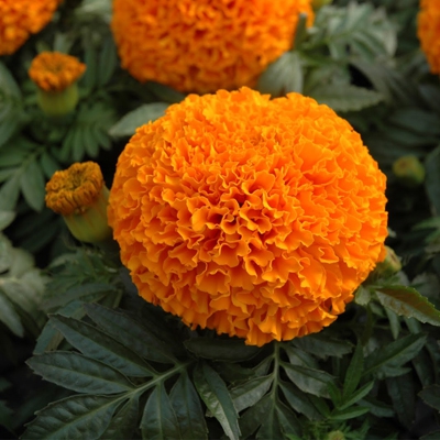 Прямостоячий ветвистый куст высотой 30 см, диаметром 30 см. Соцветия оранжевые, махровые, диаметром 8-10 см. Светолюбивы, теплолюбивы, заморозков не переносят. Предпочитают плодородные легкие почвы. Для оформления бордюров, рабаток, вазонов и балконных ящиков.