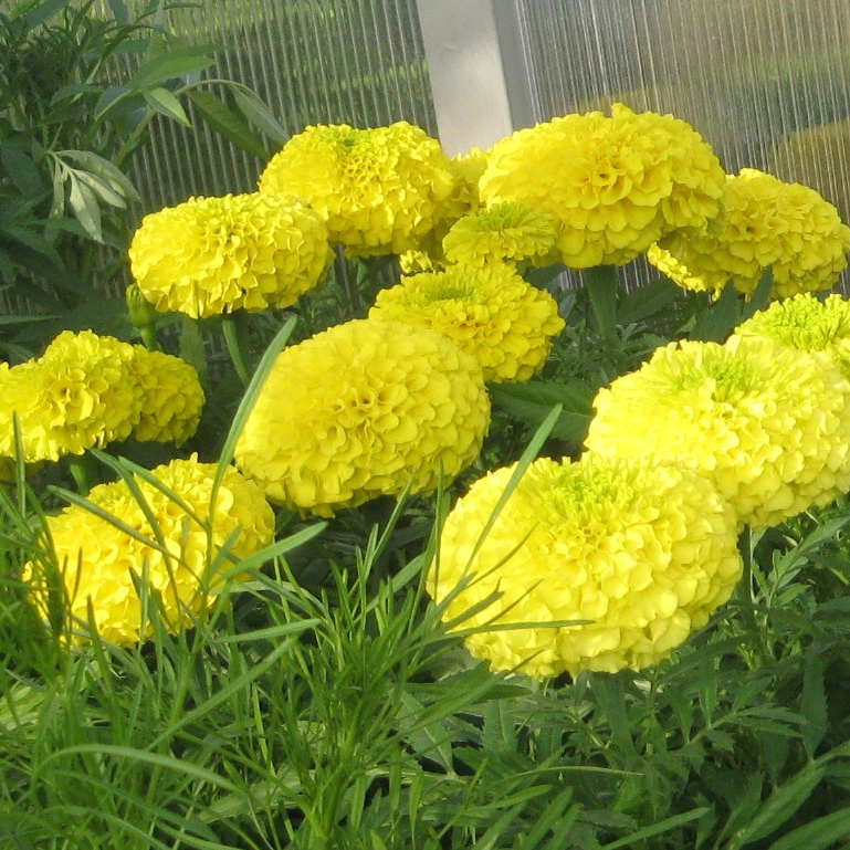 Высокорослые бархатцы с крупными, густомахровыми соцветиями Ø7-9 см. Цветение раннее, обильное и продолжительное. Кусты высотой до 90 см, сильноветвистые, с большим количеством цветоносов. Прекрасно держат форму и не разваливаются от дождя и ветра. Растения неприхотливые, засухоустойчивые, легко переносят пониженные температуры. Отлично смотрятся в цветниках. Подходят для срезки, в воде стоят до 15 дней.