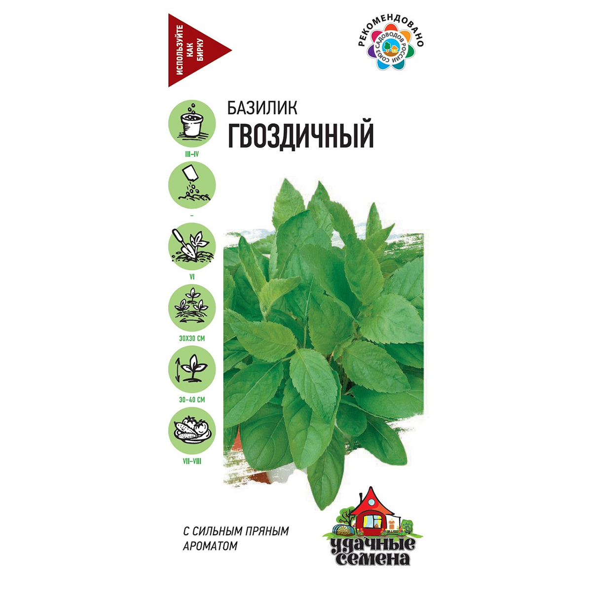 Раннеспелый (30-40 дней от всходов до первой срезки зелени) сорт. Растение среднерослое, высотой 30-40 см, компактное. Листья крупные, длинночерешковые, яро-зеленые, морщинистые, край зубчатый. Аромат сильный, с гвоздичным, или гвоздично - анисовым привкусом. Выращивают рассадным способом. Базилик предпочитает хорошо структурированные, богатые гумусом почвы. Нуждается в регулярных поливах. Используется в свежем виде в качестве салатной зелени и пряновкусовой добавки, а также натурального ароматизатора в кулинарии и при консервировании.