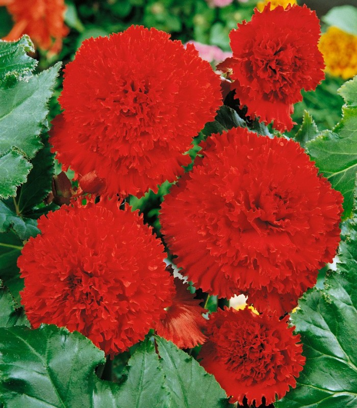 Бегония Фимбриата Скарлет (Begonia Fimbriata scarlet) – элегантная бахромчатая бегония, высотой до 40 см, с нежными темно-зелеными ажурными листьями. Крупные карминно-красные цветки, до 10-15 см в диаметре, с резными кончиками сильно гофрированных лепестков выглядят довольно причудливо и прекрасно будут смотреться в любом уголке дома или сада, в групповых композициях с пестрыми цветами или на балконах и лоджиях. Цветут с начала лета до заморозков, источая тонкий сладкий аромат. Сорт не зимостойкий.
