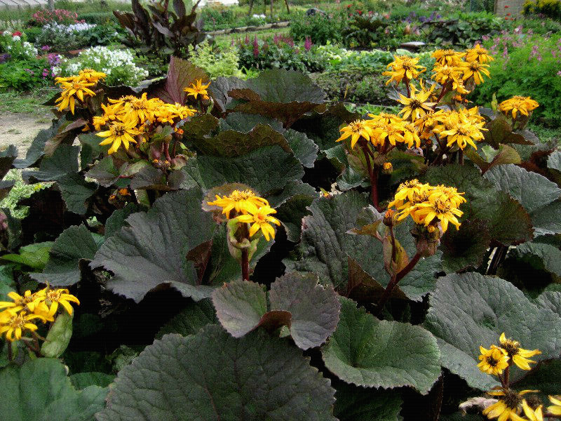 Бузульник зубчатый Dark Beauty "Ligularia dentata Dark Beauty" - имеет высоту 90 - 120 см. Листья большие, блестящие, сердцевидные, тёмно-фиолетовые. Соцветие в виде ярких ромашек оранжевого цвета.