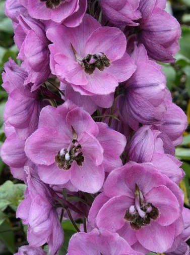 Дельфиниум Dusky Maidens - характеризуется плотным расположением цветков на цветоносе-колосе длиной 60-80 см. Цветки полумахровые, темно-малиново-розового цвета, с коричневым центром. Высота растения от 1,4 м до 1,8 м. Сорт декоративный, мощный и устойчивый к заболеваниям.