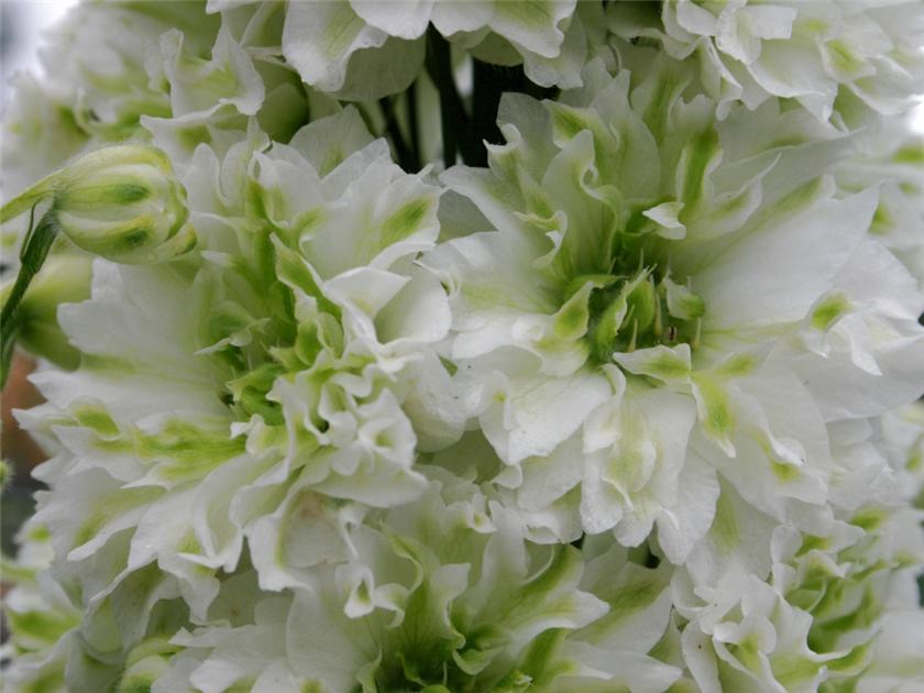 Дельфиниум Green Twist характеризуется плотным расположением цветков на цветоносе-колосе длиной 60-80 см. Цветки махровые, бело-зеленые. Высота растения от 160 см до 200 см. Цветение обильное и длительное. Cорт устойчивый к заболеваниям.