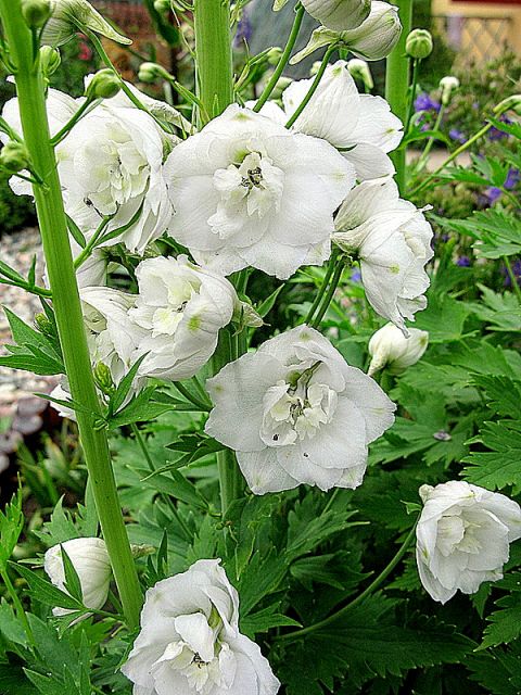 Дельфиниум Crystal Fountain - величественный многолетник, образующий пышный куст. Цветет в начале лета крупными махровыми, красивой формы, белоснежными цветками, густо покрывающими мощные многочисленные цветоносы, высотой 1,5-2 м. Цветение очень обильное и длительное - июнь - август.