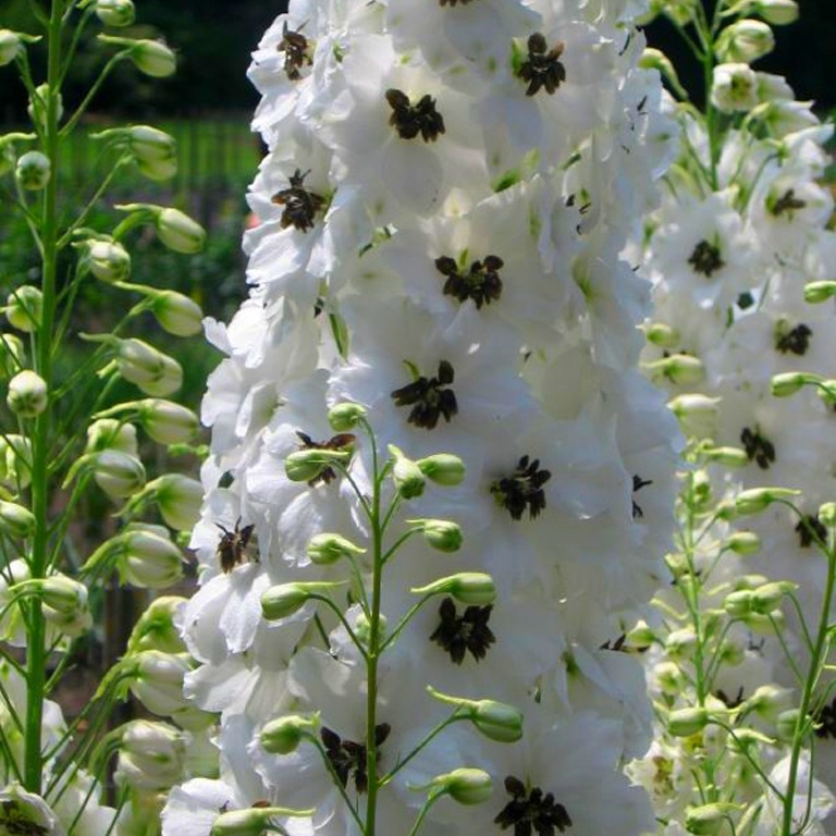 Рассада дельфиниума культурного White with Dark Bee привлекает роскошной красотой пышных махровых цветков, украшенных темными бабочками по середине. Это создает очень эффектное сочетание, которое прекрасно впишется в любой цветник или клумбу. Обрезайте отцветшие соцветия, чтобы обеспечить декоративность растения и получить возможность восхищаться красотой повторного цветения. Для лучшего роста рассады выбирайте солнечные участки, на которых высокое растение защищено от ветра.Саженец дельфиниума культурного White with Dark Bee в среднем вырастает до 90 см. Разделение и рассаживание этого многолетника выполняют раз в 4-6 лет в зависимости от природных условий.