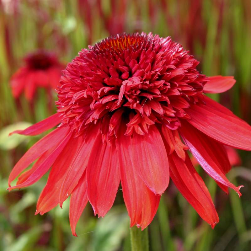 Эхинацея пурпурная Eccentric (Эксцентрик). Цветки большие, помпонные, яркие. При раскрытии имеют насыщенный красный цвет с оттенками фиолетового, постепенно переходя в огненно-оранжевые и алые тона. Цветки распускаются не одновременно, поэтому на растении наблюдается фейерверк различных оттенков. Кустик компактный, высотой 60 см. Сорт прекрасно подходит для срезки.