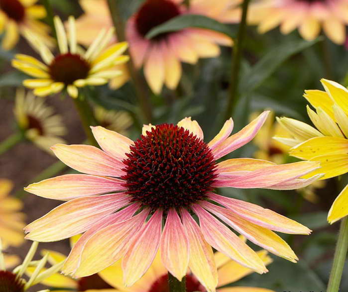 Эхинацея пурпурная Ивнинг Глоу: Цветки двухцветные. Жёлтый цвет лепестков переходит в абрикосовый и тёмно-розовый у основания. Лепестки окружают оранжево-красный конус. Сорт идеально подходит для срезки. Стебли сильные, хорошо разветвлённые. Хорошо растёт в жарких засушливых районах.
