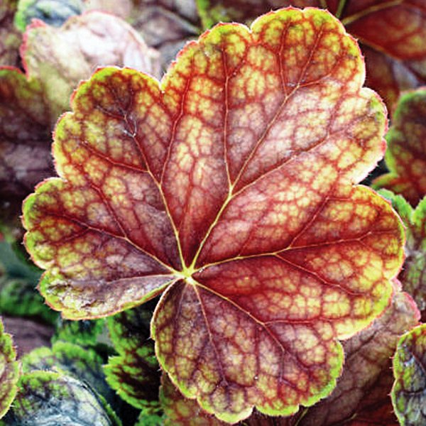Гейхера GAUGUIN - растение высотой около 30 см и диаметром 35 см. Куст компактный. Листья слегка выпуклые, зеленые, с пурпурно-сливовыми прожилками. По мере роста листва краснеет и приобретает четко выраженную зеленую кайму. Цветки розовые. Сорт зимостойкий.