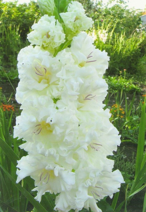 Гладиолус Белый медведь - высокорослый гигант. Цветки диаметром 14 см, гофрированные, белоснежные, с легким зеленоватым оттенком в горле.