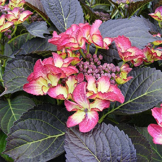 Крупнолистная гортензия сорта Dark Angel – это куст высотой до 1,5 м и шириной до 80 см с темными, матовыми листьями и плоскими щитковидными соцветиями красного и фиолетового цвета. Тон зависит от состава и кислотного баланса почвы и обильности подкормок. Зацветает в июле на прошлогодних одревесневших побегах, лепестки от темно-красного до темно-фиолетового оттенка со светлыми прожилками. Как правило, центральные цветки находятся в состоянии бутонов. Куст густой, а листья большие, с налетом, осенью приобретают красноватый цвет. В октябре цветение прекращается. Предпочитает влажную, рыхлую почву. Сорт Dark Angel выдерживает морозы до -23° С, но требует укрытия из земли, опилок или щепок. Хорошо себя чувствует на рассеянном ярком свету, в полутени, на утреннем и вечернем солнце (не менее 6 часов в день).