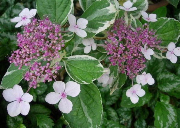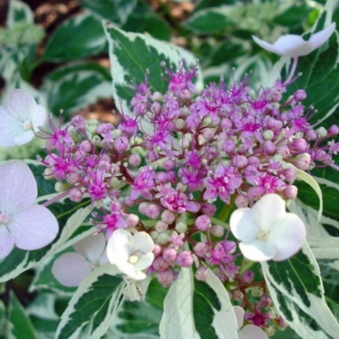 Гортензия крупнолистная Триколор - завезенный из Японии в 1843 году. Цветущий кустарник высотой 100-150 см. Цветки собираются в щитковидные соцветия до 25 см в диаметре. Период цветения – июль и август. Листва густая, трехцветной окраски – зеленовато-белые, зеленые и светло-желтые пятна. Высаживается в солнечное или полутенистое место с плодородной, хорошо дренированной почвой. Требует укрытия