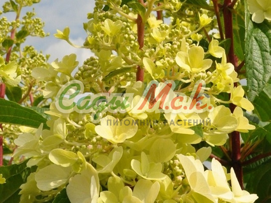В переводе - «Свет горящей свечи» - имеет высоту 1,2 м, сильные, прочные побеги, темно-бордовые, почти фиолетовые в верхней части, создавая эффектный контраст с пышными соцветиями. Листья ярко-зеленого цвета, удлиненно-овальной формы, с мелкозубчатым краем. Стерильные цветки, а их большинство, с 4-5 лепестковидными чашелистиками, слегка удлиненными, вершина которых с небольшой выемкой в виде сердечка. Лепестки едва перекрывают друг друга и немного приподняты вверх, создавая чашеобразную форму. Цветки сначала жёлто-зелёные, затем приобретают кремово-золотистый оттенок. Цветение пышное, продолжительное. Не теряет декоративности осенью, соцветия годятся для зимних букетов. Сорт универсального назначения: живая изгородь, прекрасный цветовой штрих в любой композиции, шикарный солитер. Сорт требователен к почвам: предпочитает богатые гумусом и хорошо дренированные, любит солнечные места, но может адаптироваться и в полутени. Зимостоек