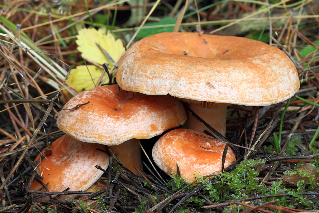 Гриб Рыжик Деликатесный - шляпка 3—15 см в диаметра, толстомясистая, вначале плоская, затем воронковидная, с завернутыми внутрь краями, гладкая, слегка слизистая. Ножка 3-7 х 1—2,5 см, цилиндрическая, плотная, выполненная, позже фистулезная, одного цвета со шляпкой, при прикосновении зеленеет. Мякоть ломкая, беловато-желтоватая, на изломе быстро краснеет, а затем зеленеет, выделяет обильный на жгучий млечный сок ярко-оранжевого цвета, который через несколько часов становится серовато-зеленым. Запах приятный, фруктовый, вкус острый. Пластинки деликатесного рыжика низбегающие, частые, желтовато-оранжевые, при прикосновении зеленеют. Споровый порошок рыжика деликатесного белый со слабым желтовато-розовым оттенком.