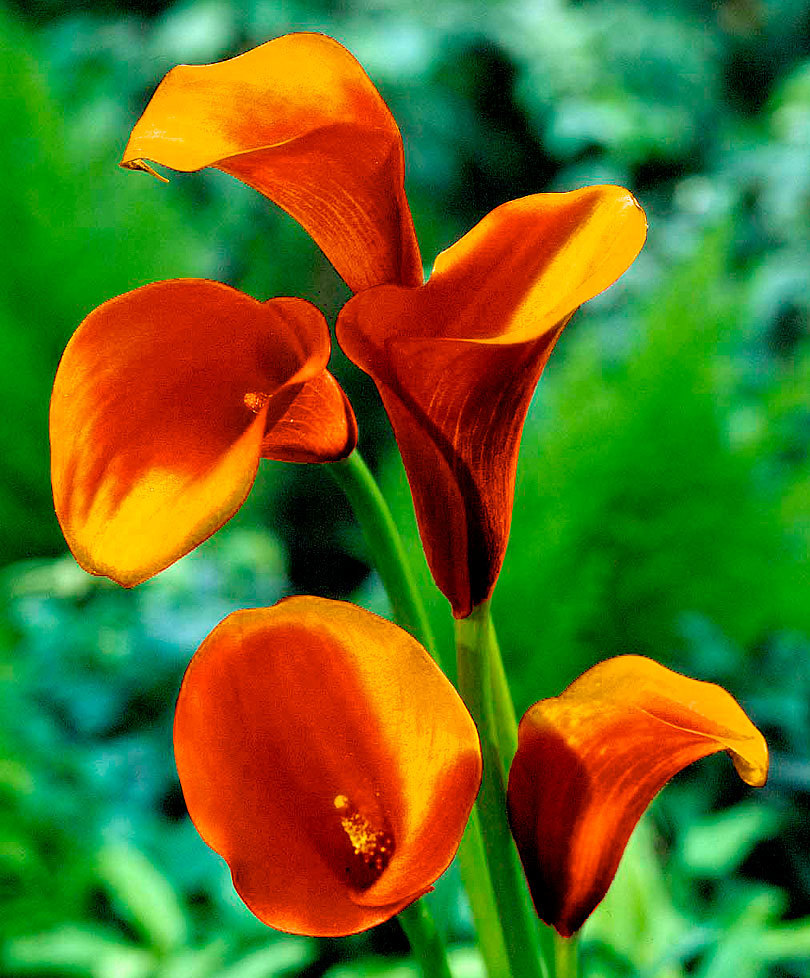 Калла Манго (Mango) – лидер продаж в этой группе сортов. Необычная окраска бокала, меняющая оттенки подобно хамелеону, никого не оставит равнодушным. Сложно сказать однозначно, каков цвет у сорта Манго. Он изменяется от желто-оранжевого до огненно-красного. Покрывало соцветия может иметь плавный переход цвета от светлого к насыщенному, рождая непередаваемую игру оттенков. Высота растения достигает 65 сантиметров. От одного корня отходит сразу несколько цветоносов. Бутоны на растении появляются в августе, цветение продолжается до конца сентября.