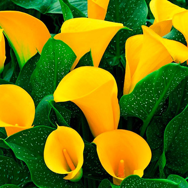 Калла Саншайн - формирует восковидный желтый бокал диаметром 7−8 см. Высота «покрывала» достигает 15 см. Рост в период цветения может составлять до 60 см.Растение формирует сразу несколько цветоносов. Охваченные крупными прикорневыми листьями стебли образуют подобие флористической композиции. Сорт отлично смотрится в срезке.