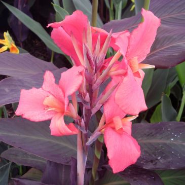 Канна карликовая Саладин- цветки ярко-оранжево-розового цвета. Цветение происходит с июля по сентябрь, запаха цветки не имеют. Высота растения достигает 1.5-2,5 метров и считается высокорослым.