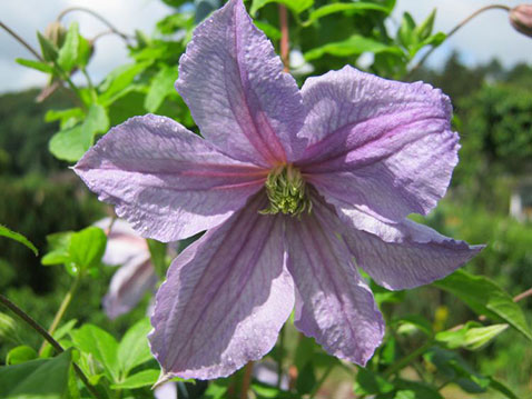 Клематис Emilia Plater - обильно цветущий польский сорт. Цветки светло-голубые с фиолетовым оттенком, с более темной полоской посередине лепестка и кремовыми тычинками, до 10 см в диаметре. Лепестки слегка загибаются вниз. Окрас может варьироваться в зависимости от кислотности почвы. Цветет сорт на побегах текущего года с июля до заморозков. Высота растения 250 - 300 см. Сорт может использоваться как почвопокровное растение.