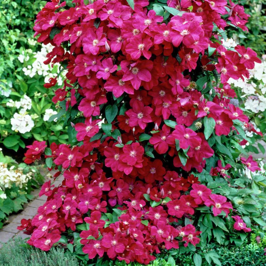 Саженцы клематиса Ernest Markham представляют собой умеренно растущий сорт с обильным цветением. Крупные бархатистые бутоны этого цветка искристые, насыщенного сочно-красного оттенка, в их сердцевине располагаются коричнево-кремовые тычинки. Распускаются они в период с июля по октябрь. Данный сорт отлично подходит для выращивания воле ограждений, беседок, решеток и сеток. Клематис может хорошо карабкаться вверх по естественным опорам, например, по деревьям и кустарникам. Это растение довольно сильно любит солнечный свет, но боится ветра. Идеально подходит для выращивания в больших контейнерах.