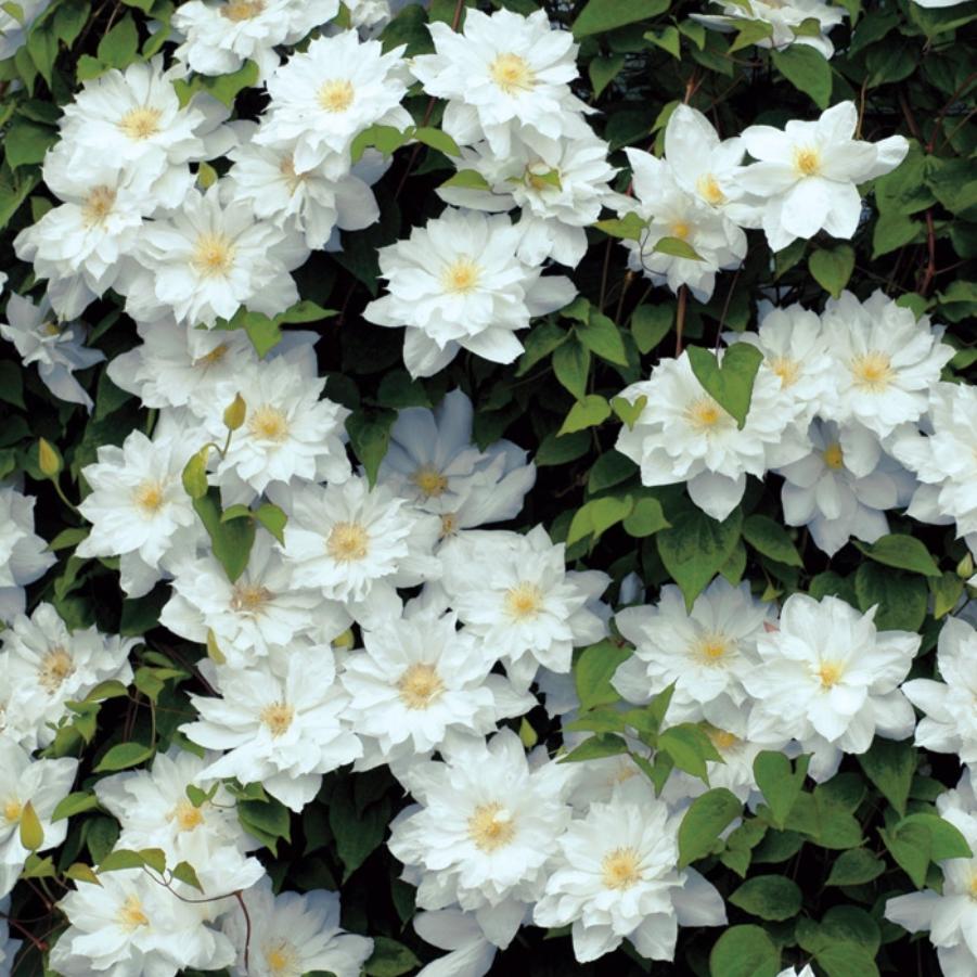 Клематис Isago - японский сорт с большими белыми махровыми цветками. Диаметр цветков - 12-14 см. Цветки раскрытые, густомахровые, чисто-белые с желтыми тычинками. Цветение продолжительное: май-июнь - на побегах прошлого года, август - до заморозков - на побегах текущего года. Цветки отлично контрастируют на темном фоне листвы. Высота растения - 2,5-3 м.Сорт морозостойкий.