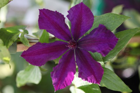 Клематис Honora - яркий представитель поздних сортов клематисов. Цветки фиолетово-пурпурные, бархатистые, с волнистыми краями лепестков. Тычинки красно-пурпурные. Цветёт в июне-сентябре. Размер цветков - 14-16 см. Высота растения - 300 см. Сильнорастущий сорт.