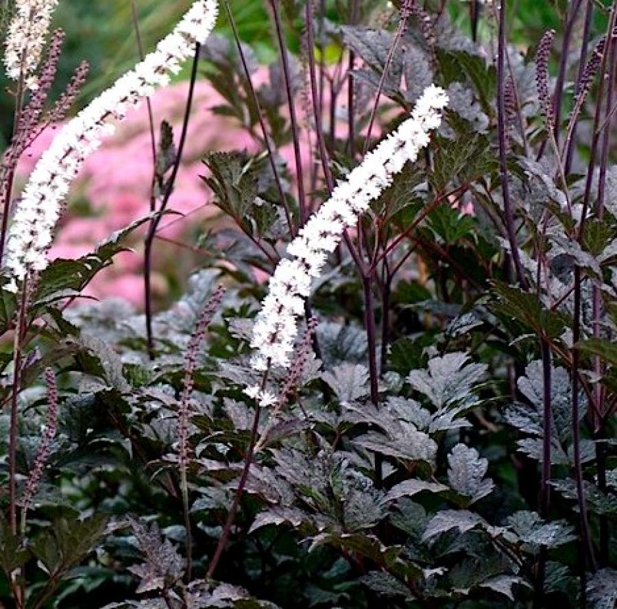 Клопогон Black Negligee - красивоцветущий многолетник. Высота растения достигает 1-1,4 м. Листья темно-пурпурные, с шоколадным налетом. Цветки маленькие, белые, с розово-красными крапинками, собраны в соцветия. Аромат цветков отличный.