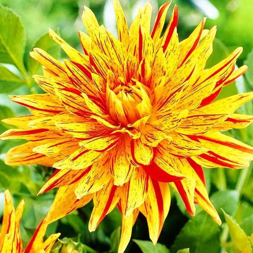 Цветы Георгины бахромчатой Вайнсом ярко-желтого цвета, лепестки пестрят красными штрихами. Структура лепестков на цветах игольчатая, с рассеченными кончиками. Высота стеблей в 90 см позволяет формировать срезанные цветы в красивые долгостоящие букеты.