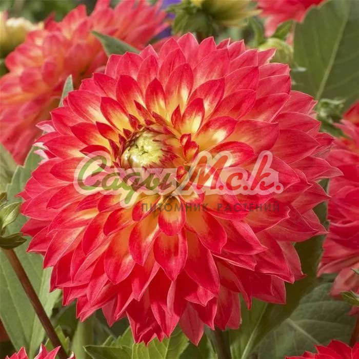 Клубни георгины Файрпот (Dahlia Firepot) добавят садику огненного очарования. Это красивые, высокие цветы, ставящие яркий акцент в клумбе. Растения нетребовательные, но любят солнечные места и легкие почвы. Радуют цветением все лето, часто даже до середины осени. Шарообразные махровые бутоны отличаются заметной, красивой окраской. Лепестки насыщенно-красного цвета, который ближе к основанию переходит в огненно-желтый. Из-за этого кажется, будто Георгина декоративная Файрпот горит изнутри ярким пламенем. Изумрудная зелень только добавляет очарования. Диаметр бутона – около 20 сантиметров.