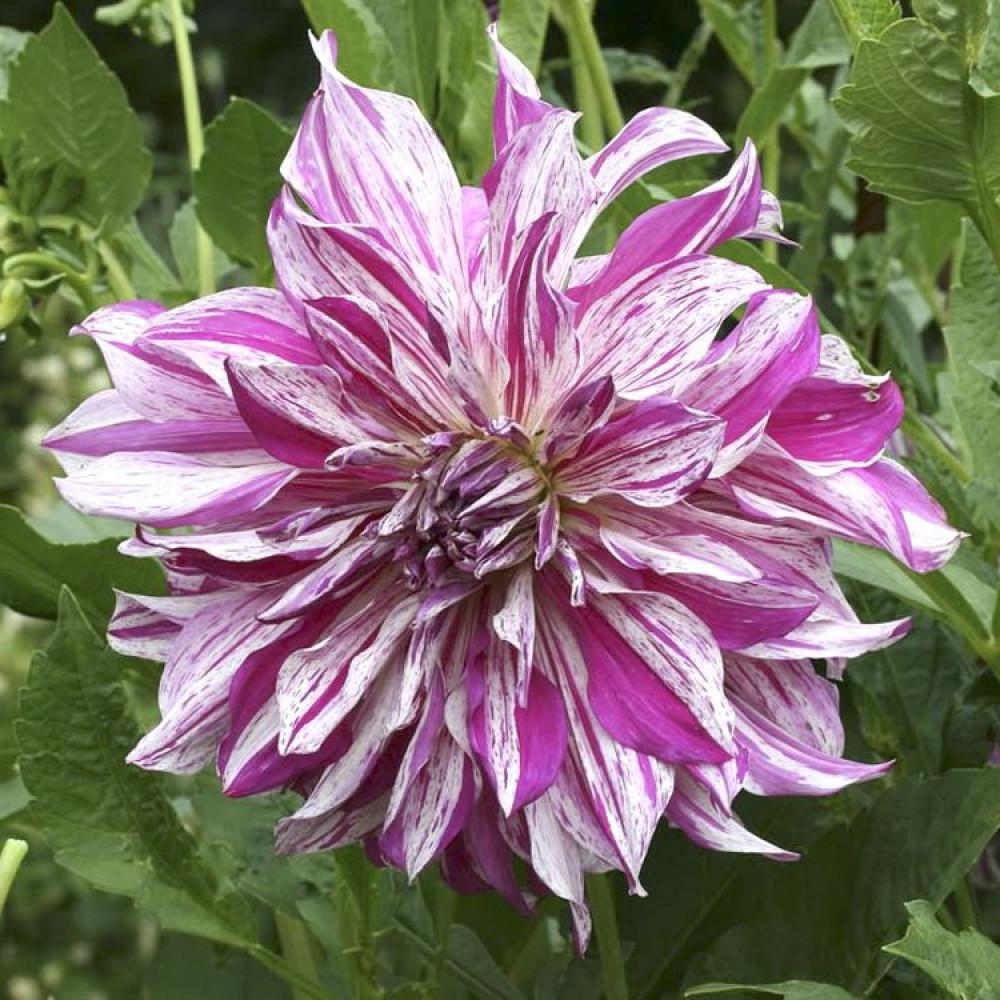 Георгина декоративная Тайхейо (Dahlia cultorum) — это фантастическая смесь лиловых пятен, полос и вкраплений на белом фоне. Это лилово-белое буйство образует гигантские цветы, для которых диаметр в 25 см — привычное дело.