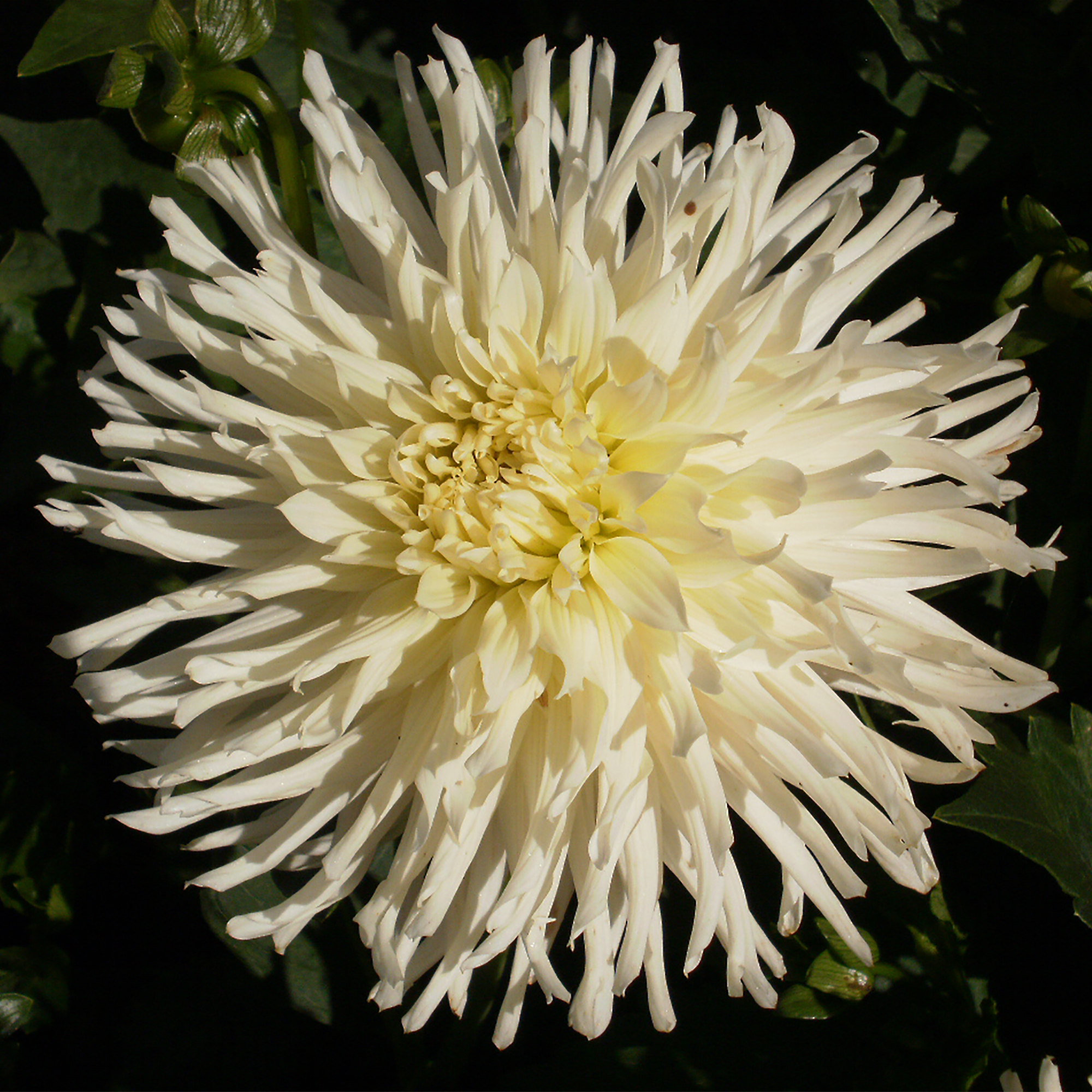 Клубни Георгины Кактусовой Уайт Стар (Dahlia Cactus White Star) ландшафтные дизайнеры рекомендуют для использования при оформлении цветников, клумб и бордюров. Растение достигает 100-120 сантиметров в высоту, обильно ветвится, создавая пышно цветущие кусты на период с июля по сентябрь. У сорта перистые листья и соцветия-корзинки. Цветки крупные до 14 сантиметров диаметром и более, состоят из лепестков, скрученных в трубочки (острые кончики напоминают колючку кактуса). Окраска георгины сливочно-белая. Срезанные букеты отлично смотрятся и долго сохраняют свежесть. Георгина кактусовая Уайт Стар любит солнечный свет, регулярный полив, рыхление. На зимний период клубни выкапывают на хранение.