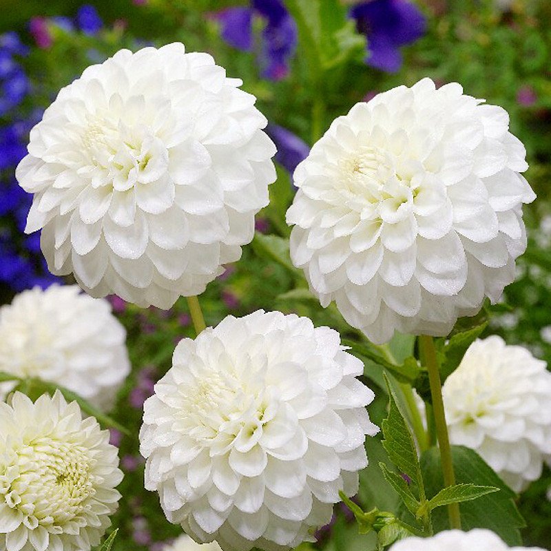 Цветы Георгины помпонной Петрас Веддинг крупные, полностью белые, до 10 см в диаметре. Они имеют форму шара, а каждый лепесток свернут вдвое и расположен симметрично остальным. Растение можно выращивать для среза — соцветия плотные, долго сохраняются в воде, хорошо сочетаются с другими цветами любых оттенков.