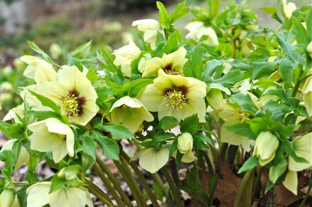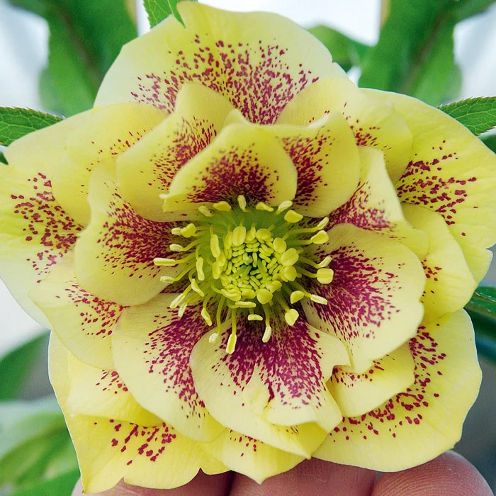 Очаровательный морозник с бледно-жёлтыми махровыми цветками. Лепестки покрыты точечным тёмно-бордовым рисунком.