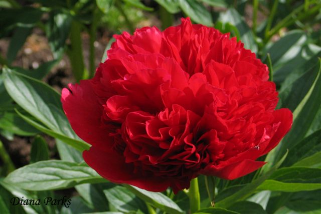 Крупномер пиона Красная мантия, 100 см, изящно переливается на солнце, немного изменяя окрас. Пионы светолюбивы, для посадки необходимо выбирать место, защищенное от порывов ветра, с рыхлой почвой. Предварительно рекомендуется перекопать посадочные ямы, добавив органических удобрений. Сорт требует подкормки и регулярного полива.