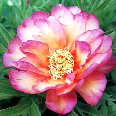 Пион ИТО-гибрид Julia Rose очень красивый сорт. Крупный полумахровый цветок, до 18 см. Меняет окраску по мере распускания цветка от вишнёво-красного к апельсиново-розовому и позже к жёлтому с яркими красными мазками по лепесткам. Куст компактный, высотой 80-90 см.
