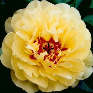 Травянистый пион Yellow Waterlily полумахровый. Цветок крупный, жёлтый с розово-красными пятнышками в центре. Куст округлой формы. Высота 80 см. Листья темно-зеленые. Цветение очень обильное.