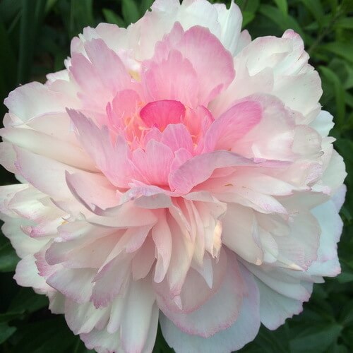 Травянистый пион Joker махровый. Цветок очень красивый, 18 см, вначале тёмно-розовый, затем светлеет, а по краям появляется тонкая розовая кайма, все лепестки широкие, высота 80 см, стебли прочные, средне-раннего срока цветения.