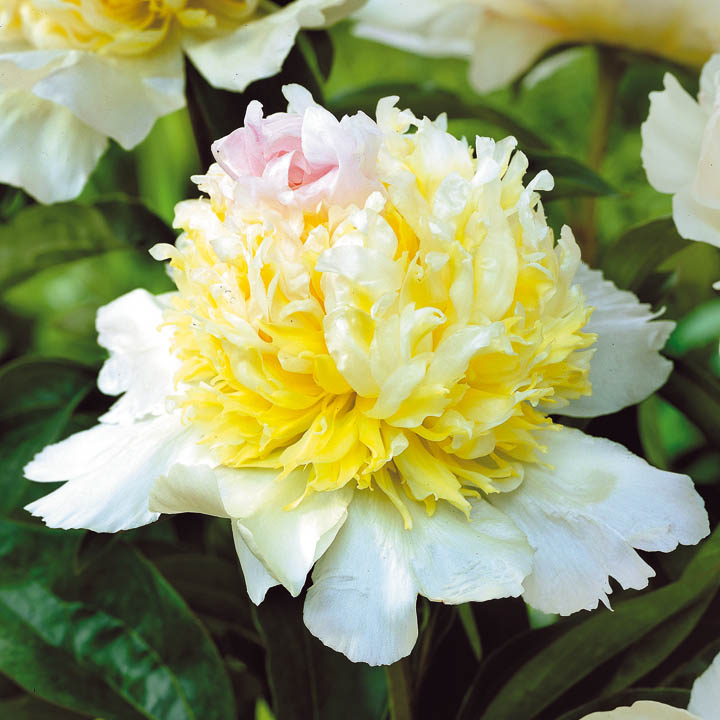 Саженцы пиона Top Brass – это настоящее украшение для любого сада. Крупные махровые соцветия имеют круглую форму, нижние молочно-белые широкие лепестки словно образуют чашу. На ней располагается шар с игольчатыми лепестками лимонного цвета с белыми вкраплениями. На верхушке лепестки нежно-розовые, а в сердцевине находятся короткие желтые петалодии. Стебли этого травянистого пиона очень прочные, высота куста может достигать девяносто сантиметров. Саженцы Top Brass неприхотливы в уходе, они могут произрастать на любой садовой почве. Они с легкостью переносят даже самые морозные зимы и резкие перепады температур.