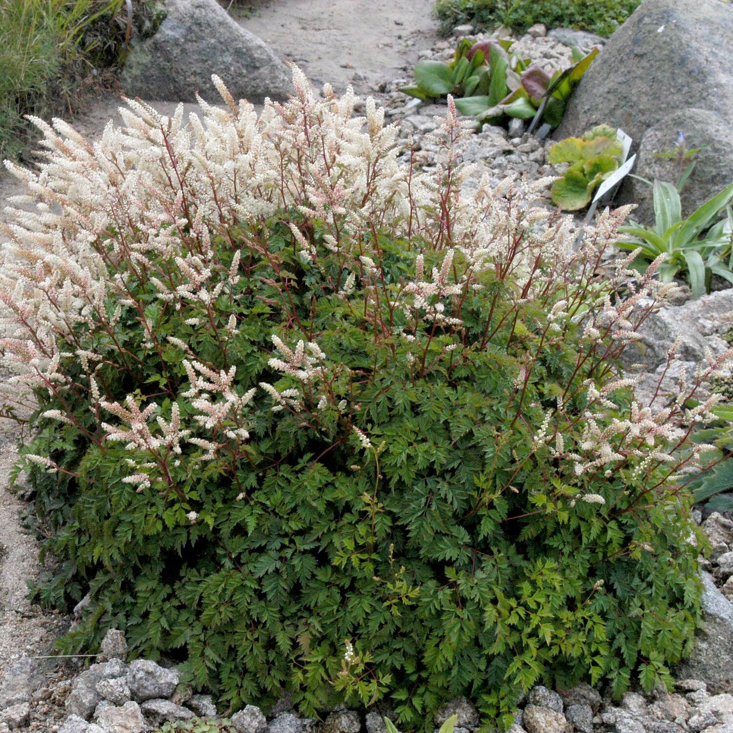 Волжанка низкорослая (Aruncus) размещается на полу- или полностью затененных участках. К составу почвы культура неприхотлива, но для большей декоративности она нуждается в достаточном уровне влажности. Сорт отличается компактными размерами. Высота прямостоячих стеблей желто-зеленого цвета достигает всего 30 см. Диаметр кустиков может доходить до 50 см. Цветет Волжанка низкорослая с июня месяца на протяжении 30 дней. Соцветия-метелки состоят из множества кремово-белых цветочков. Используют Волжанку низкорослую в бордюрах, миксбордерах, групповых посадках.