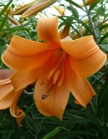 Лилия African Queen - цветы кремово-оранжевого цвета с бронзовыми подпалинами с внешней стороны цветка, с очень сильным ароматом. Диаметр цветка 15-16 см. Цветет сорт обычно небольшими кистями из 3-5 цветков. Высота растения достигает 90 см. Эта лилия отлично подходит для срезки, групповых и одиночных посадок. Растение развивается из одной луковицы, с которой простягается один сильный стебель, на верхушке которого распускаются цветы.