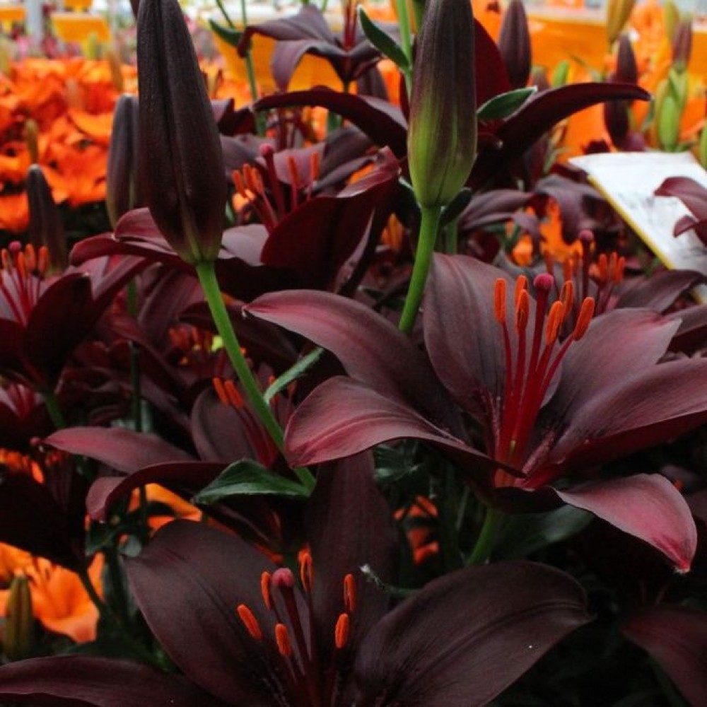 Луковицы лилии азиатской Дарк Секрет (Dark Secret) уместно разместить для контраста на клумбе с преобладанием белых цветов. Растение обладает крупными бутонами насыщенного вишнево-бордового цвета, отливающего синевой. Длинные пурпурные тычинки с оранжевыми головками только подчеркивают глубокий оттенок лепестков. Длина цветоноса лилии этого сорта 100 сантиметров. Уже в июне на растении раскрываются цветы диаметром 16 сантиметров. Цветение продолжается 2 месяца. Одновременно на стебле раскрываются до 5 бутонов. Лилия азиатская Дарк Секрет подходит для выращивания во всех климатических зонах, кроме Крайнего севера.