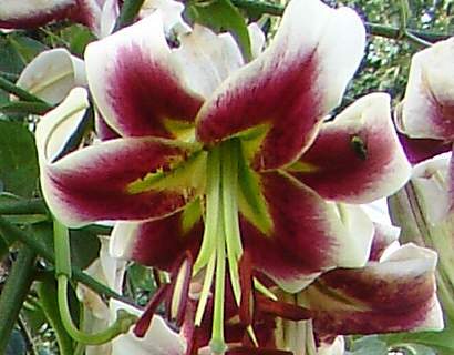 Лилия Leslie Woodriff - многолетнее луковичное растение. Этот гибрид еще называют «Лилия –дерево». А все потому что высота растения 150-250 см. Цветки средней величины, диаметром 15 см, смотрят вниз. Окраска цветков: темно малиново-вишневый центр с ярко-белой каймой по краю лепестков и большим зеленым горлом, окруженным желтой каймой. В первый год, то есть в год посадки стебель бывает относительно слабым и несет всего несколько цветов, но со временем хорошеет, достигая 1,5 м в высоту, и образует 20 и более цветков. Листья темно-зеленые, продолговатые, поочередные. Период цветения – август.