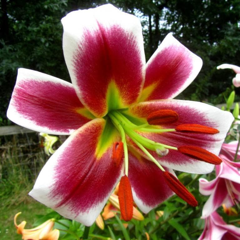 - Характеристики КРУПНЫЙ, бордово-малиновый с белым кантом и кончиками лепестков, пыльники ярко-оранжевые, диаметр цветка 22 см