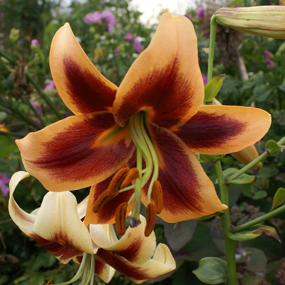 Луковицы Лилии ОТ-гибрид Ред Морнинг (Lilium OT-hybrid Red Morning) как нельзя лучше подойдут саду с большим количеством зелени. Многолетний цветок обладает уникальной особенностью — его оттенок зависит от освещенности. Крупные, около 20 см в диаметре цветки со сложной окраской меняют цвет в течение дня. Винно-красное основание лепестка переходит после середины в ярко желтые концы, возле сердцевины небольшое количество бордового крапа — дневной вариант. При вечернем освещении или теневых посадках концы лепестков Лилии ОТ-гибрида Ред Морнинг становятся темно-желтыми, а основания темно-бордовыми, крап пропадает. Это исключительно оптический эффект из-за сочетания фактуры и оттенков цветка.