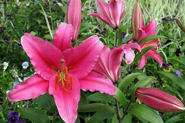 Лилия Acapulco - многолетнее травянистое растение. Высота побегов лилии этого сорта до 120 см, на верхушке семь крупных цветков до 15см в диаметре. Лепестки немного отгибаются, по центру идет насыщенно розовая полоса, у основания ярко-розовые веснушки, края лепестков слегка гофрированные, бледно-розовые. Пыльники и рыльце пестика бордовые, создают яркий контраст.