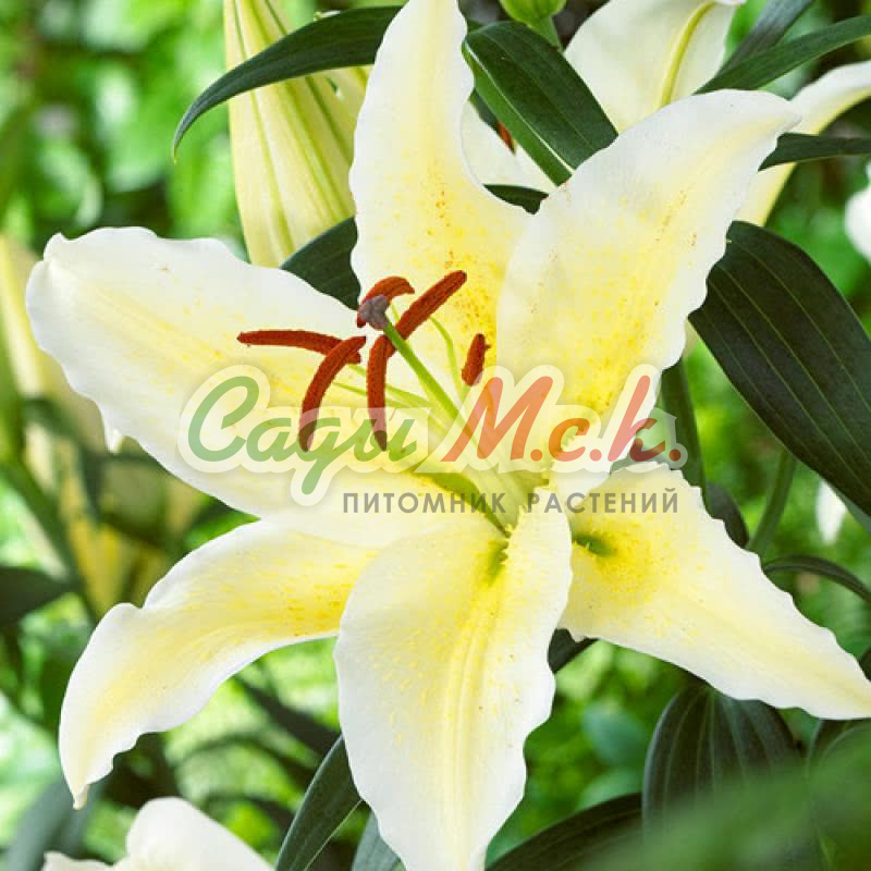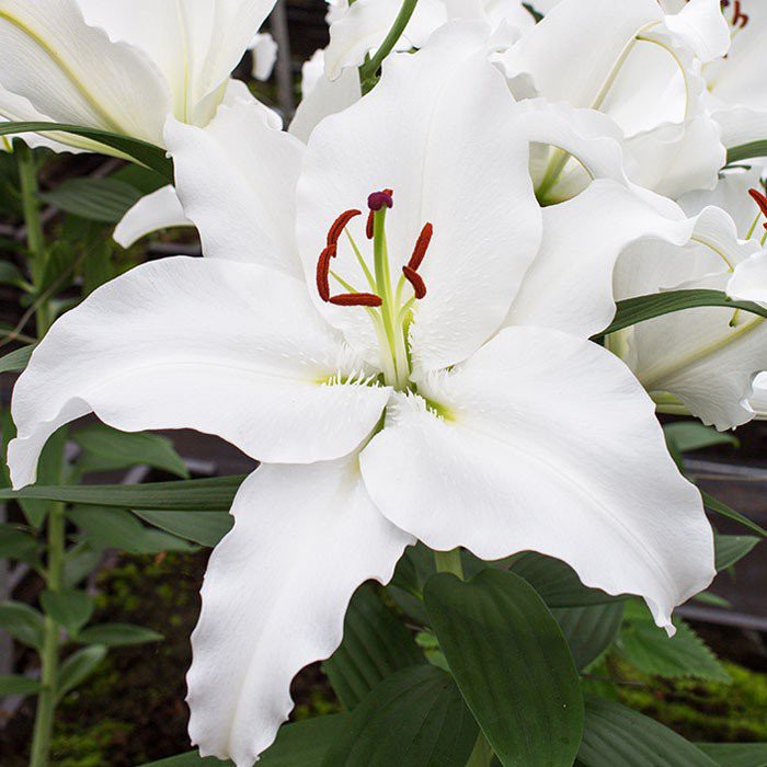 Луковицы лилии восточной Алма-Ата (Lilium oriental Alma Ata) — отличное дополнение к любой цветочной композиции. Цветы этого сорта крупные (до 20 см в диаметре), расположены на цветоносах группами по 10–15 штук. Их лепестки махровые, классического белого цвета, удачно контрастируют с темно-коричневыми пыльниками. Лилии цветут долго и обильно во второй половине лета. Лилия восточная Алма-Ата неприхотлива к условиям содержания и отличается высокой морозостойкостью. Под укрытием он может выдерживать температуру до –34 градусов, оставаясь на зиму в открытом грунте. Взрослые растения достигают 90 см. Их стебли очень прочные, а лепестки крепко держатся и долго не осыпаются, поэтому лилии особенно популярны для выращивания под срезку.